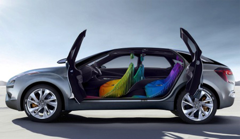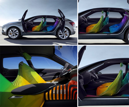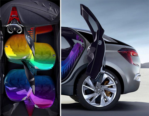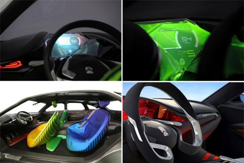 Les places sont disposées de manière hélicoïdale de part et d’autre d’une hélice centrale. Toutes les couleurs de l’arc en ciel sont déclinées à l’intérieur et l’ambiance de l’habitacle est déterminée par une caméra capable de mesurer les paramètres anthropométriques du visage du conducteur. En fonction de ses observations, il intervient sur l’illumination.