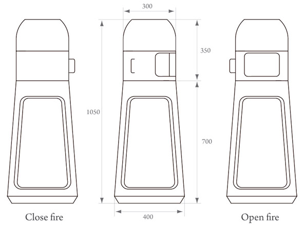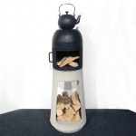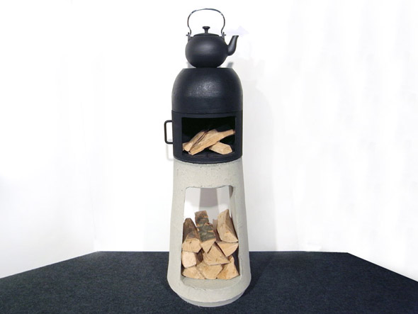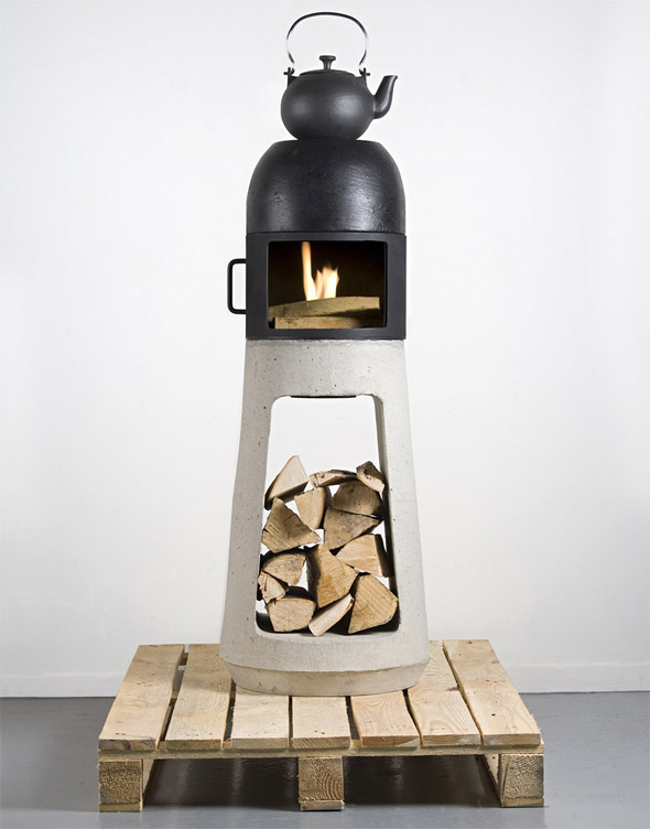 Le designer Suisse Wuehl Yanes a conçu cette cheminée sculpturale. Avec une structure en béton creuse elle permet d’avoir une surface de stockage du bois. L’évacuation se trouvant à l’arrière de la cheminée il est possible de poser sur la cheminée une bouilloire ou une casserole remplie d’eau afin d’humidifier un peu l’air de la pièce.
