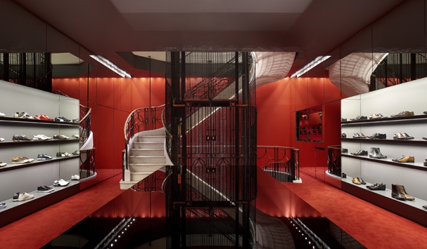 La boutique flagship de la marque de chaussure Kurt Geiger. Un peu dans l’idée d’un « palais des miroirs », l’espace se reflète avec une mise en abîme qui nous fait perdre nos repères.