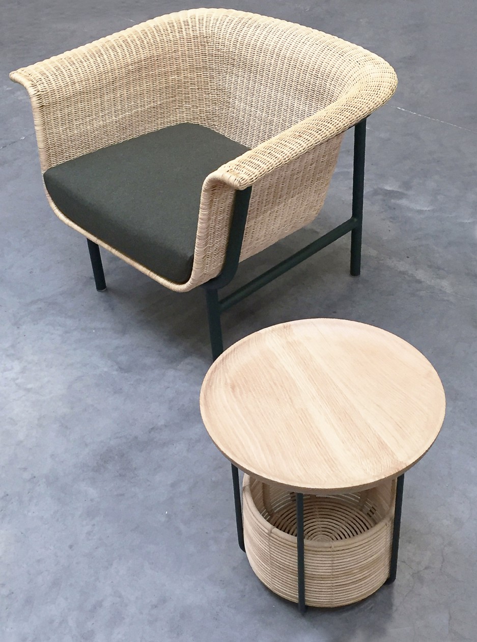 Toute la collection d’Alain Gilles repose sur la logique de la construction des sièges en rotin classiques, mêlée à un esprit plus contemporain. Son intention est de créer une réelle discussion entre deux systèmes de fabrication apparemment antinomiques. D’une part, le designer utilise un ancien savoir-faire manuel pour l’assise. Il magnifie véritablement un authentique système de tissage du rotin. D’ autre part, une ossature tubulaire issue du monde industriel sert à maintenir l’assise.