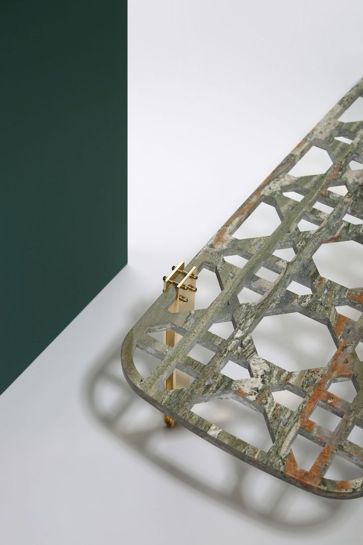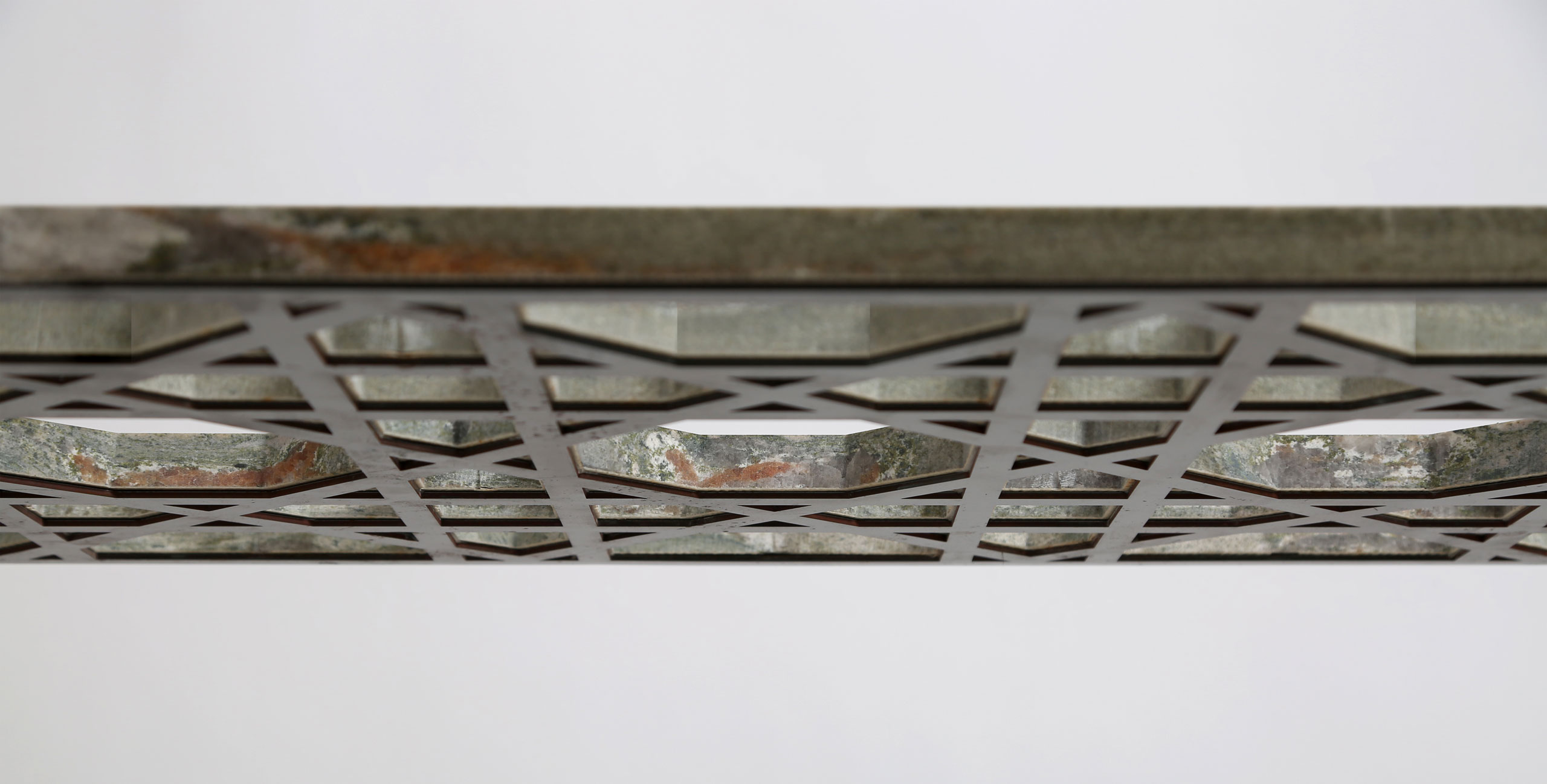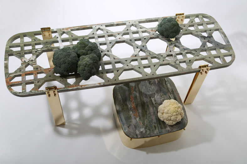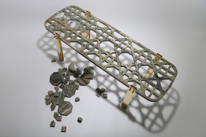La table « Everlastingreen » est un sculpture à elle seule. Le plateau en marbre vert Gauguin est composé d’une ornementation complexe. Les motifs géométriques qui décorent le plateau se retrouvent d’ailleurs sur les assises de « Khayzaran Fairuz ». Richard Yasmine a souhaité redonner ses lettres de noblesse à la culture libanaise. Ce projet met en avant une culture riche de mélanges civilisationnels. En effet, le Liban regorge de matériaux, de lignes, de motifs à investir. La table « Everlastingreen » est un bel hommage rendu au Liban. Une preuve que les esprits créatifs de la région Mena parviennent à inscrire leurs traditions dans le paysage du design contemporain. Le motif découpé dans du marbre semble presque léger. Les formes évidées confèrent un côté aérien qui contraste fortement avec les pieds en acier et en laiton.   Everlastingreen par Richard Yasmine sur Design Maroc  Everlastingreen par Richard Yasmine sur Design Maroc
