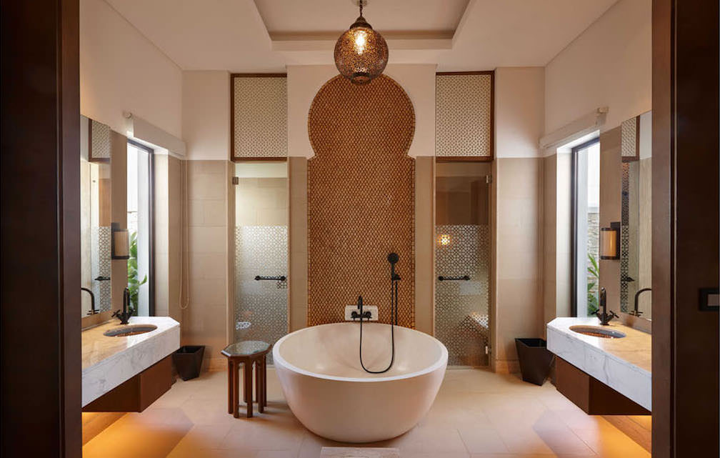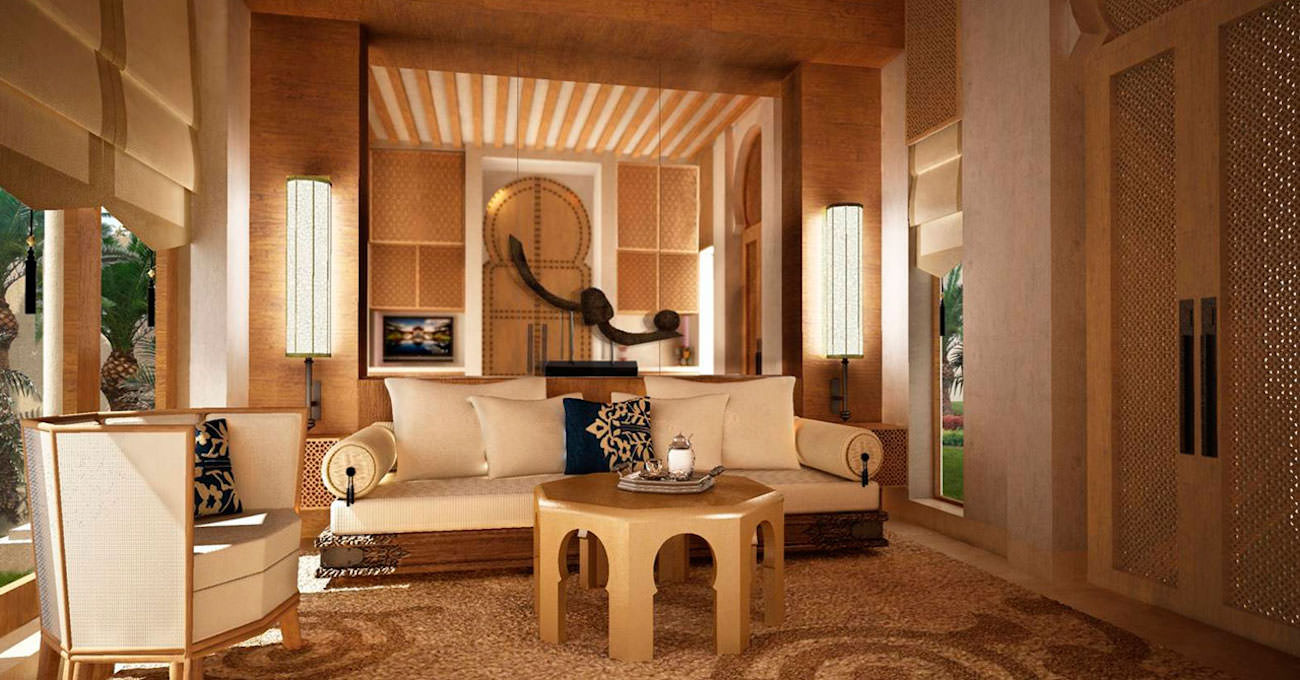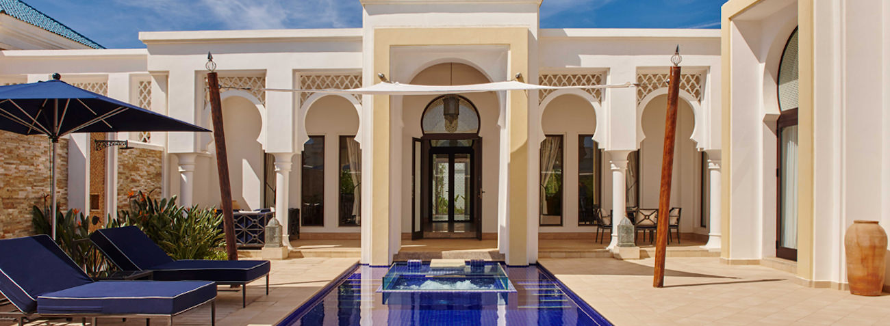 Pour commencer, nous voilà dans le jardin. Derrière ces majestueux palmiers marocains, nous pouvons voir une magnifique architecture marocaine rappelant les casbah, palais fortifiés d’Afrique du Nord. Un patio aux arches marocaines sublimes entoure la villa. Les murs sont blancs, en tadelakt. Ce matériau est un enduit de chaux à l’eau, brillant et imperméable, utilisable en intérieur comme en extérieur. Cet enduit traditionnel est originellement employé pour rendre étanches les citernes d’eau mais aussi utilisé pour façonner les bassins comme ceux de l’hôtel.