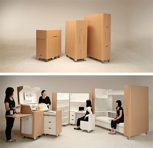La collection « Kenchikukagu series » créé par le studio japonais Atelier OPA nous propose un bureau, un lit et une cuisine mobiles. Ces meubles sont non seulement mobiles, mais ils peuvent également se ranger dans une « boite » à roulettes. Une réponse aux problèmes d’espace de plus en plus fréquents de nos jours.