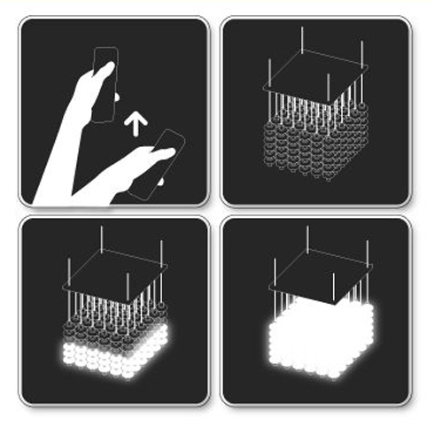 WaNetLight est une suspension lumineuse, composée de 25chandelles en verre soufflé. Elles dessinent une matrice lumineuse tridimensionnelle. Des gestuelles naturelles commandent la modulation de la lumière et composent des volumes lumineux. Ce dispositif introduit une nouvelle forme de manipulation et de simplicité dans la pratique des produits électroniques.