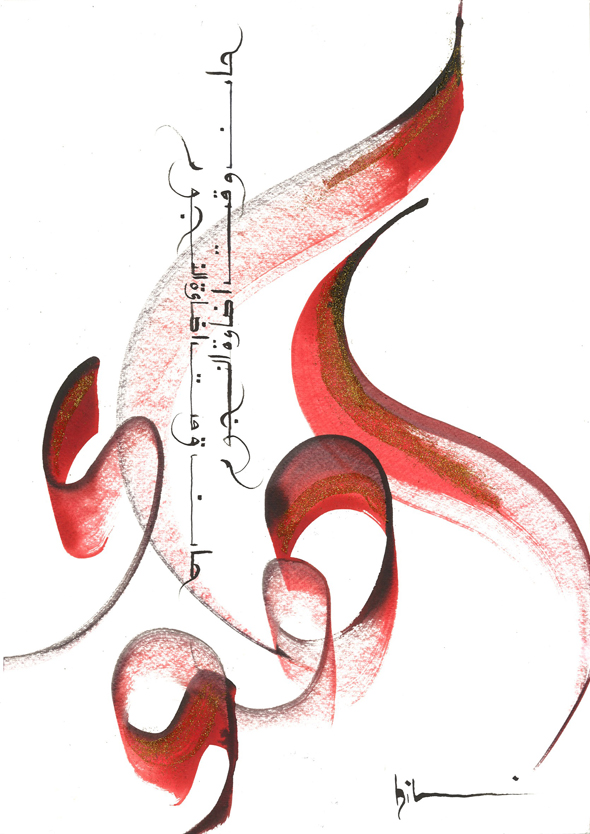 Devenue depuis une des rares femmes calligraphes arabes, j’ai un style moderne et épuré et une approche assez libre de la calligraphie. Mon désir est avant tout de mettre en valeur les lettres arabes car j’ai toujours été fascinée par leurs lignes complexes et harmonieuses.