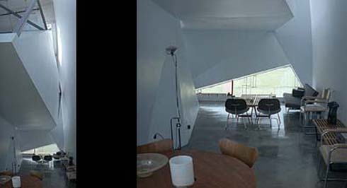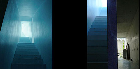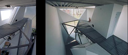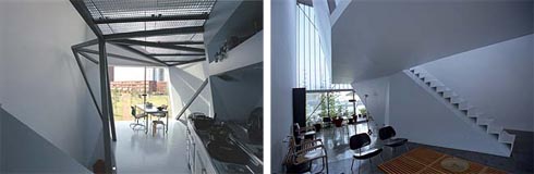 Les escaliers y représentent un espace à part entière, ils sont ouverts et incorporent une plate-forme avec un développement qui se fait en trois étapes: le premier niveau est occupé par le salon, le deuxième par la chambre et la cuisine et le troisième par le bureau et une salle de bains.
