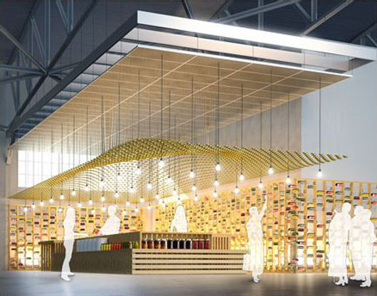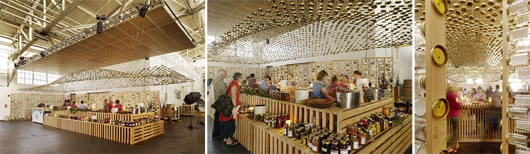 Conçu par l’agence SP Architects à partir de l’idée que le pavillon « Pickles et Chutney » se doit d’exploiter les éléments qui sont généralement associés au processus de décapage. La conception est donc faite à partir d’une suspension de plus de 3000 couvercles de pots Mason, et des murs remplis de pots Mason avec des recettes de marinades et des images du monde entier.