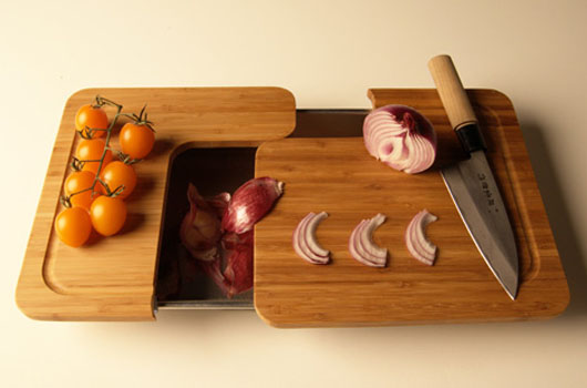 Le Bamboo Appetito résout ce problème avec une partie de la surface de coupe qui s’ouvre et dissimule un plateau en acier inoxydable qui récupère les déchets.