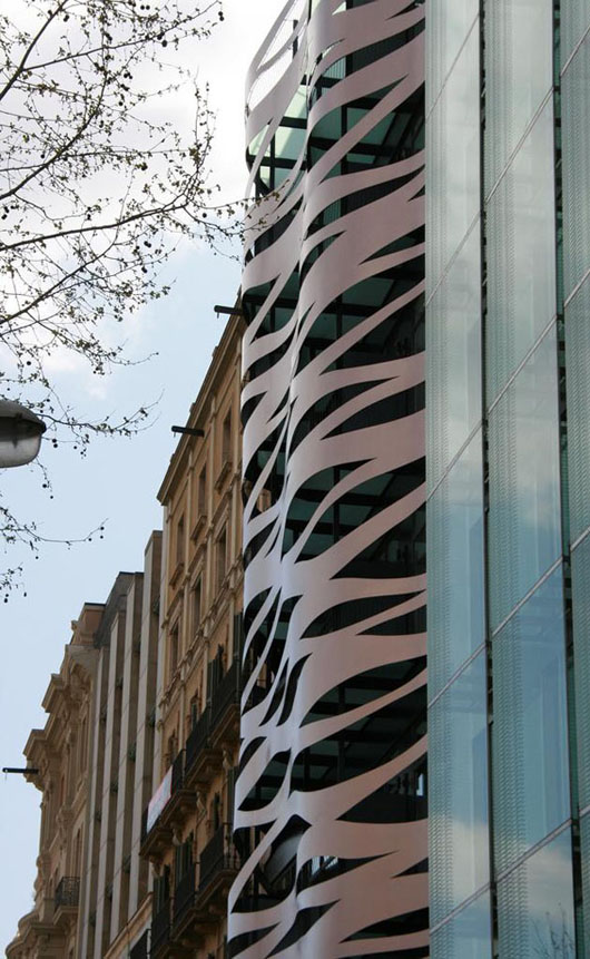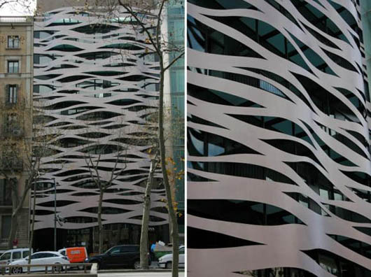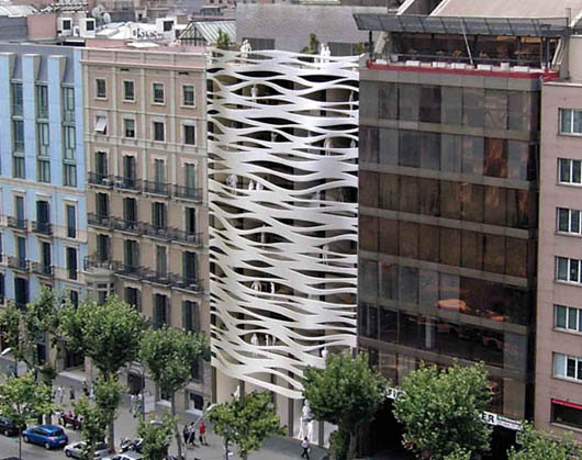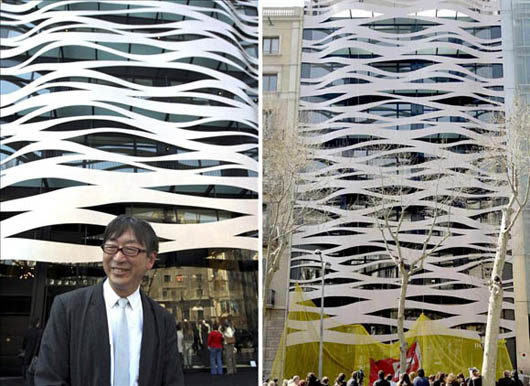 Je vous présente aujourd’hui la façade extérieure du nouveau « Suites Avenue Hotel » à Barcelone, récemment achevé par l’architecte Toyo Ito. Il a vraiment fait quelque chose de frais et d’original. Ito a fait un excellent travail dans la transformation de ce qui était auparavant un immeuble de bureaux terne par la création d’une étonnante façade en vagues qui, affirme-t-il, a été inspiré par son amour de l’œuvre d’Antoni Gaudi.