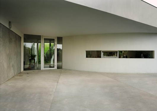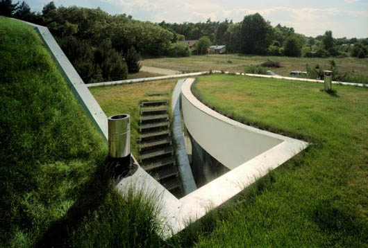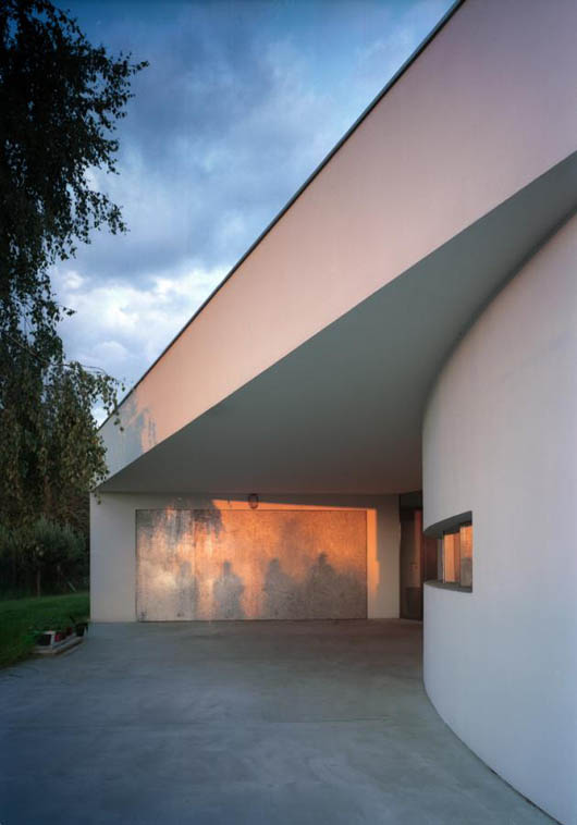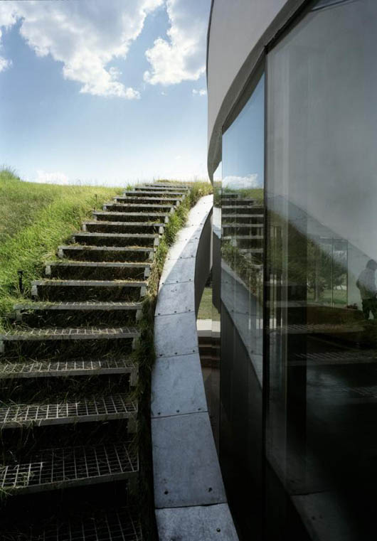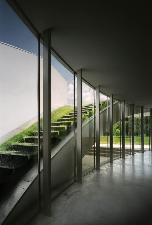 Une clairière verte entourée par la forêt était le seul cadre envisageable pour ce projet de maison. D’où l’idée de « tailler » un morceau de l’herbe recouvrant le site, de le déplacer et de le traiter comme une toiture, et d’organiser toutes les fonctions nécessaires en-dessous. Quand le tout fut prêt, le client a eu une nouvelle requête, créer un espace pour un petit studio d’enregistrement et une véranda. Cette dernière a été obtenue en reliant le rez-de-chaussée avec l’herbe du toit en « incisant » dans le plan supérieur et en « redescendant » ce fragment à l’intérieur du bâtiment.