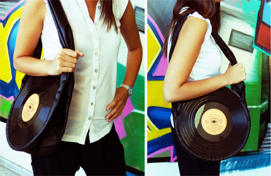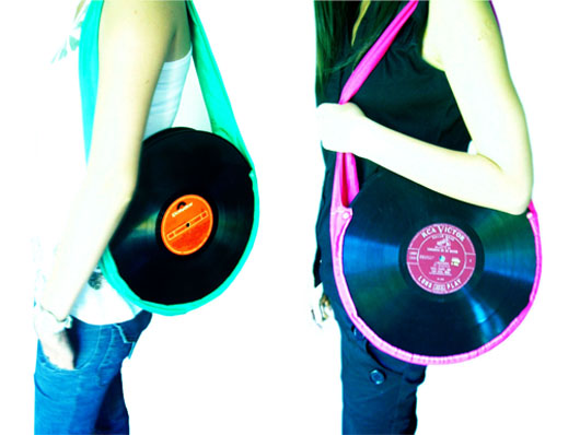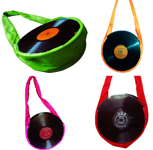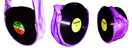 Bonne idée, un peu dans la veine des sacs Freitag, avec tout le coté chaque sac est différent par la couleur de la toile associé aux étiquettes des vynils! +1 =)