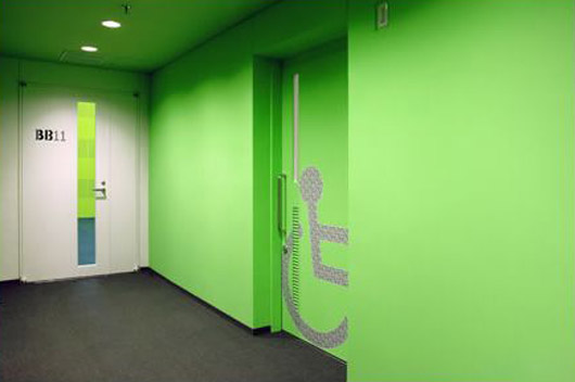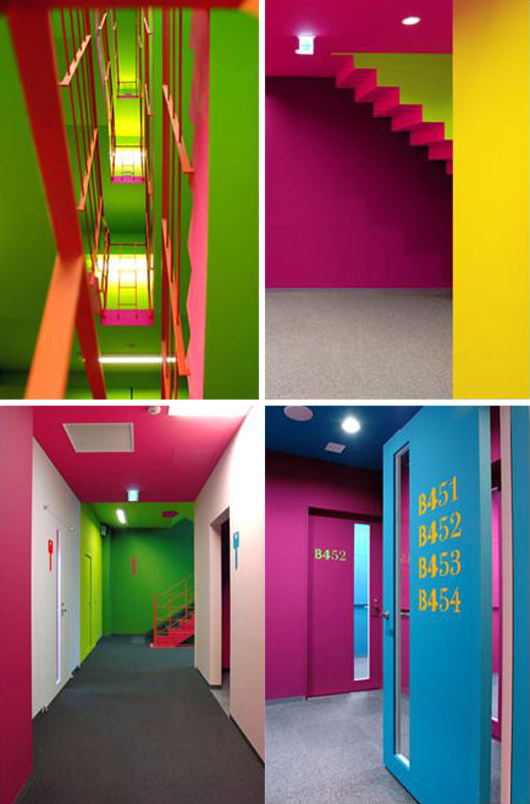 Vous devrez vous sentir à l’aise entouré par des couleurs vives, si vous planifiez de faire vos études à Tokyo, dans la dernière version de la célèbre école de musique « Senzoku Kaguen College of Music« . La « Black Hole« , telle qu’elle est appelée sur son site, a des studios d’enregistrement, des studios multimédia, des salles de classe d’orgue électronique, des laboratoires, et des studios de pratique pour le jazz, le jazz vocal, la pop et le rock. Les couleurs intenses des murs et des plafonds sont devenues le principal élément de design, et les principales illustrations se trouvent peintes à même le mur, et sont de très grande taille. La totalité de l’école a été conçue par le studio Terada Design & Architects.