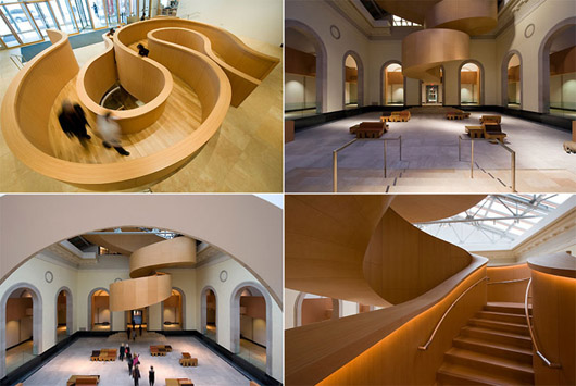 Il est normal que le septuagénaire Frank Gehry ait fini par ré-envisager l’Art Gallery of Ontario (AGO) de sa ville natale de Toronto. Lorsqu’il était enfant, Gehry visitait souvent l’AGO et l’effet de ces visites sur lui et sa carrière a été très important. Gehry a vécu la majeure partie de sa vie aux États-Unis, mais le fait de retravailler l’AGO à permis à Toronto de profiter de certains avantages de son énorme talent, avant qu’il ne soit trop tard. Une des premières sources d’inspiration de Gehry a été l’architecte finlandais Alvar Aalto, connu comme le père du modernisme scandinave. L’influence de l’amour d’Aalto pour le bois, et ses lignes architecturales aérée, peut être détecté dans le travail de Gehry dans l’AGO. Qu’il s’agisse ou non d’une pensée envers Aalto quand il a conçu la spirale de contreplaqué pour le hall d’entrée principal est sans pertinence, mais la sensation de l’espace est décidément « Aalto-esque ».