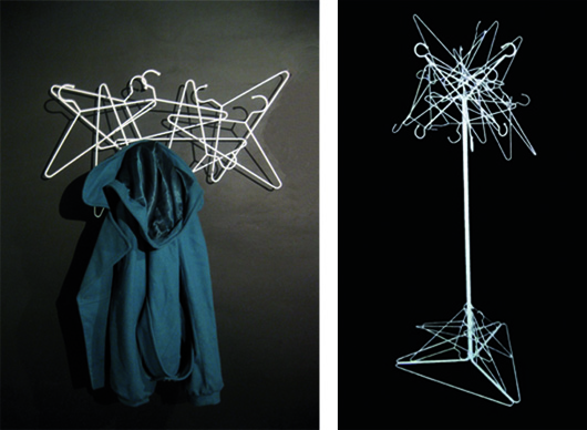 On dit souvent que le plus complexe est de retravailler les objets les plus faciles et les plus connus. C’est pourtant ce qu’à très bien fait Jade Barnes-Richardson. Il est même allé plus loin, il a retravaillé 2 objets simples en 1 : Il a détourné le cintre pour créer une patère ! Un rendu très graphique et plein d’originalité !