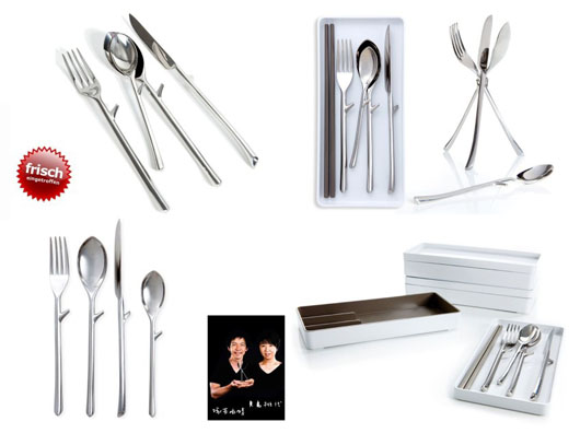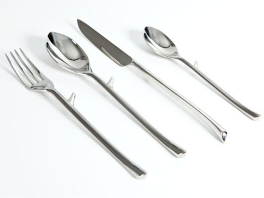 Bow Wow : Nous nous sommes rappelés des temps anciens et avons imaginé la table de dîner comme un paysage où la nature prédomine. Cela nous a fait repenser à l’époque où des outils ont été découverts pour la première fois et nous a inspiré d’utiliser des éléments naturels. Nous avons conçu ces couverts en combinant les formes minimalistes de branches et de feuilles. Pourquoi ne pas créer un paysage différent pour dîner, en combinant les trois principales pièces pour former un tipi.