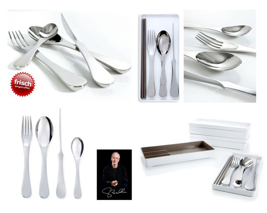 Gijs Bakker : J’ai pris une goutte d’eau et l’ai aplati pour créer la forme de base de cette conception élégante. Mes couverts iD combinent le look d’une silhouette allongée avec un grand sentiment de plasticité en un équilibre parfait. Parce que je suis un grand fan de la cuisine italienne, j’ai conçu la fourchette avec des dents très longues et une prise en main parfaite pour enrouler les spaghettis.