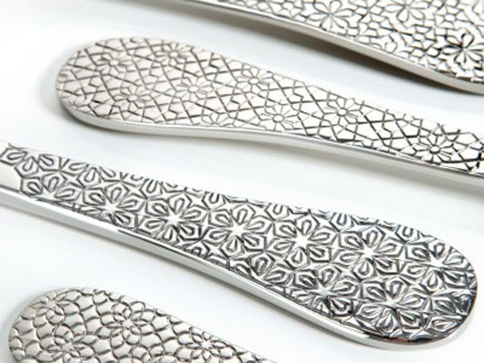 Ineke Hans : J’ai basé la forme de ma conception sur l’archétype des couverts et l’ai rendue robuste et lourde. Ils peuvent sembler plats au début, mais l’arrière est joliment gravé de motifs différents comme une référence aux dessins dont était décorée la coutellerie du passé.