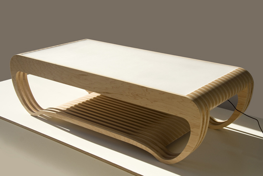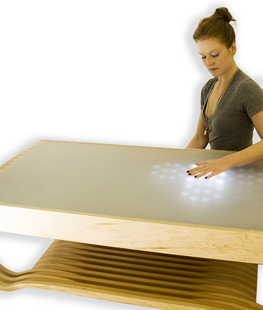 La table basse interactive The Ripple a été conçue par Because We can. Elle est fabriquée en contre plaqué d’érable et en Medex (matériau obtenu grâce à des fibres de bois recyclées). Les finitions sont réalisées grâce à un laquage de haute qualité. Cette table s’éveille lorsque des mouvements sont réalisés à sa surface. La puissance du rendu lumineux des leds est déterminée par la distance entre le mouvement effectué et la surface de la table. La table est disponible en trois longueurs: 56 cm de long, 102 cm de long, ou 147 cm de long. Les trois tables sont de la même largeur : 66 cm et de la même hauteur : 46 cm. Vous pouvez voir une vidéo du principe de fonctionnement dans la suite.