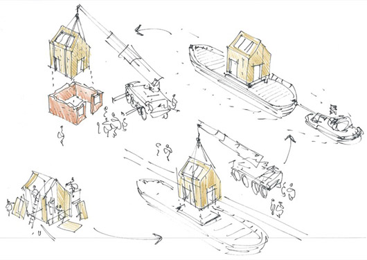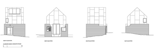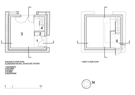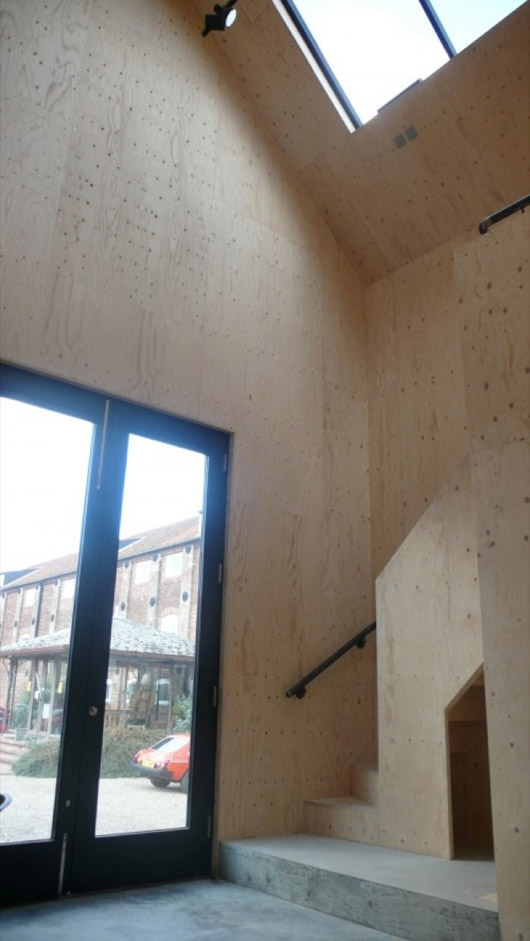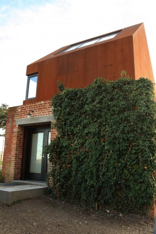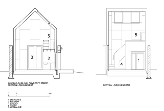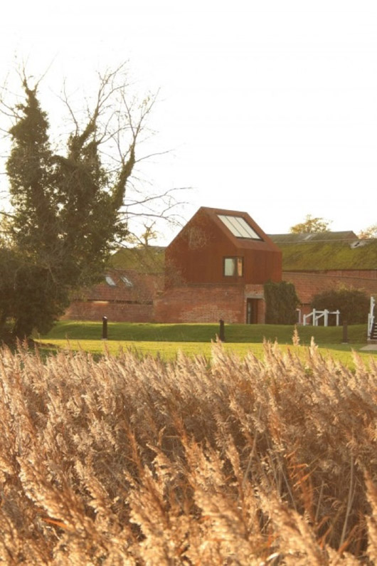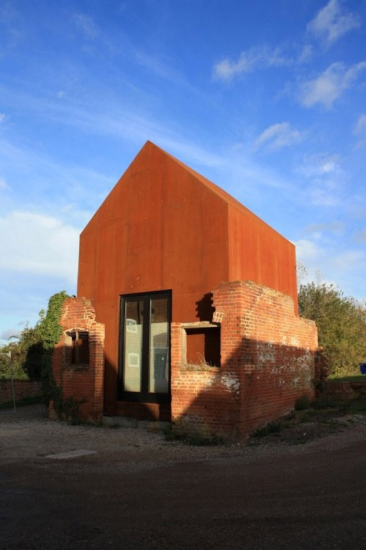 Cette coque en acier, qui héberge un studio multi-usages, a été placée dans les restes d’un pigeonnier en briques datant du vingtième siècle à Snape Maltings, Suffolk, Royaume Uni. Elle a été conçue par le cabinet d’architectes Haworth Tompkins. Situé au seuil symbolique de la malterie et des marais environnants, le bâtiment est isolé en contre-plaqué et peut servir d’espace de musique, de studio d’art visuel, de salle de réunion…
