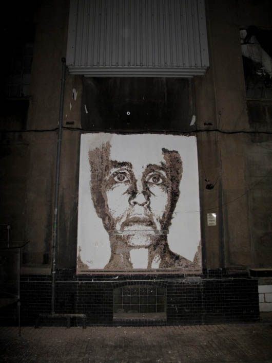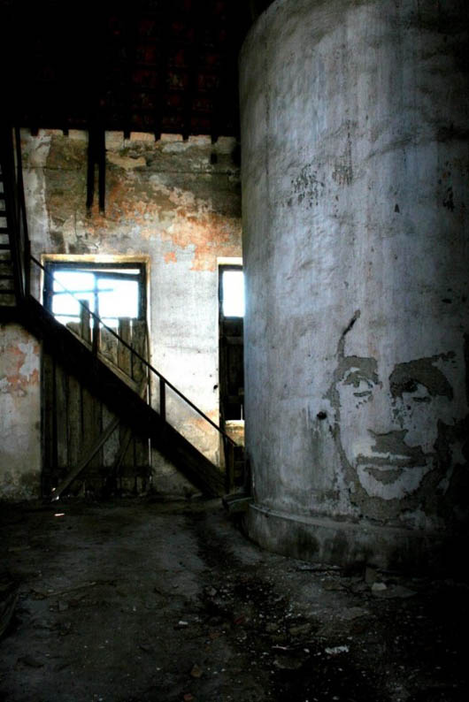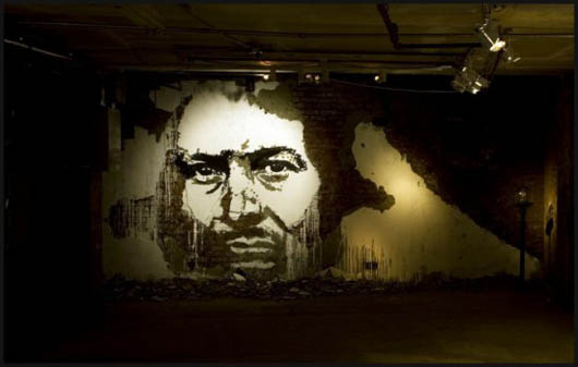 Alexandre Farto, artiste de street-art basé à Londres et d’origine portugaise, plus connus sous son pseudonyme Vhils, a réalisé une série d’œuvres intitulée Walls. Cette série représente d’immenses gravures réalisées sur des murs, où l’artiste joue avec les différentes couches du mur pour créer et laisser apparaitre les volumes.