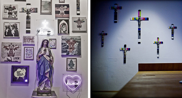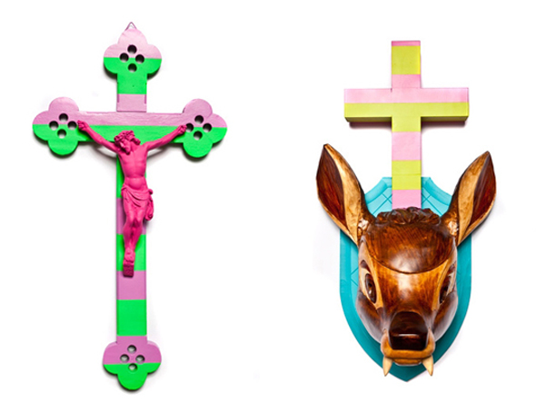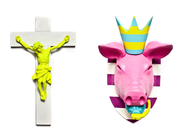 L’artiste allemand Stephan Strumbel a réalisé l’exposition Home Sweet Home à la Circleculture Gallery à Berlin. Strumbel exagère ces objets de culte populaire et de la culture avec des éléments de l’art urbain et du pop art. Ce faisant, il place ces objets dans un nouveau contexte en partie provocateur. A première vue, ces objets ne semblent pas déranger. Les sculptures en bois sont très bien conçues et, avec leur surface brillante et colorée, apparaissent comme des pièces légères et brillantes du Pop Art. Strumbel, cependant, crée à la fois une esthétique artificielle et artistique avec sa manière d’exagérer à l’extrême la forme et le contenu de ses œuvres. Ses objets provoquent et attirent le public par leur décadence et la violation des tabous.