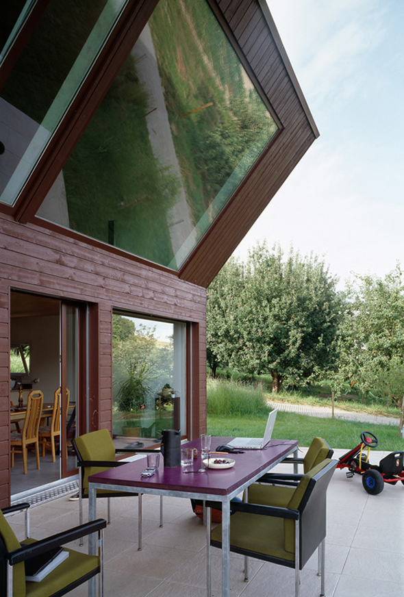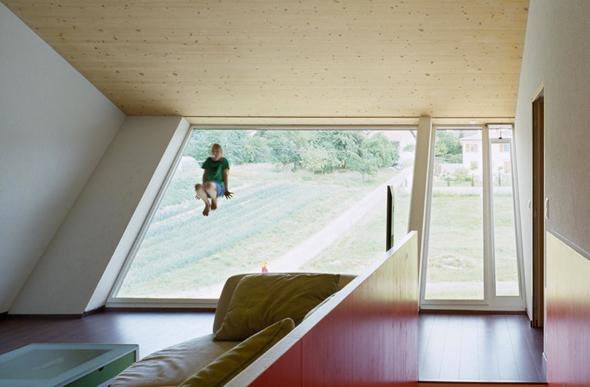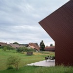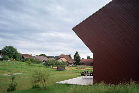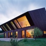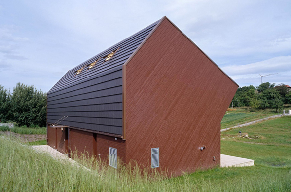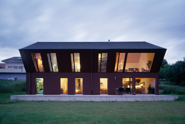 Situé dans la campagne suisse, cette petite maison nommée Crooked House et conçue par l’agence Fovea architects se distingue par sa façade anguleuse. Orienté plein sud, le volume supérieur a été développé comme un moyen d’équilibrer le besoin d’intimité et de lumière. Le deuxième niveau est incliné à un angle de 40 degrés, ce qui permet un sentiment de plus d’intimité sur la terrasse. Grâce à de grandes fenêtres la maison est totalement baignée de lumière.