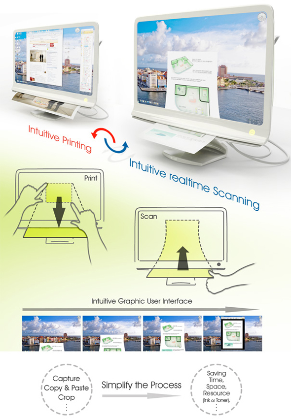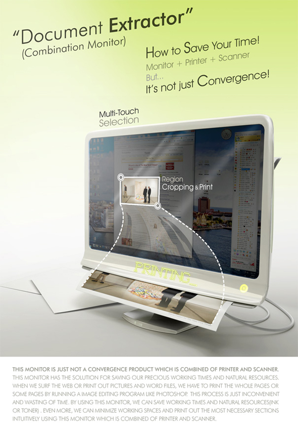 Le designer Byeong Min Choe a conçu le Document Extractor. Il s’agit d’un ordinateur avec imprimante et scanner intégrés. Ce moniteur vous permettra d’avoir un bureau plus clair. L’écran est conçu pour être tactile afin de pouvoir définir en un geste la zone à imprimer… Ce concept peut permettre un gain de temps significatif souvent perdu en aller-retour entre les différentes applications.