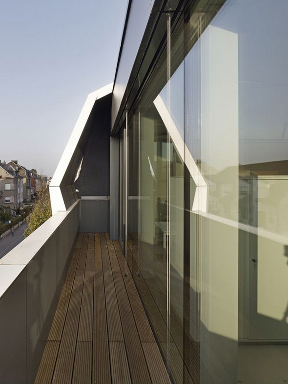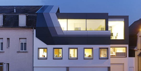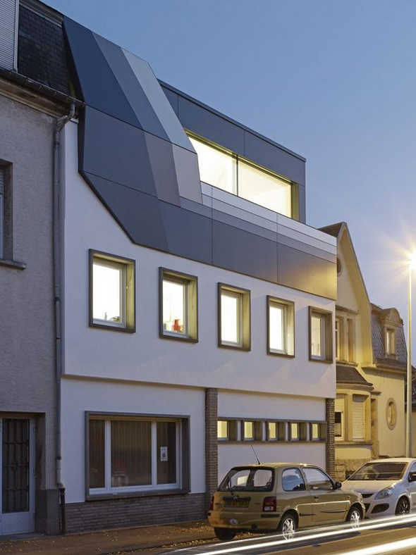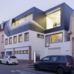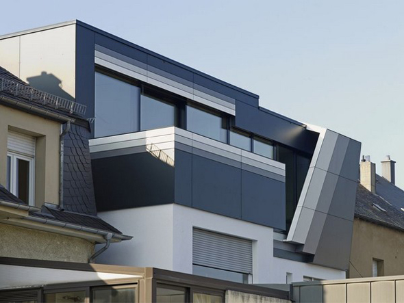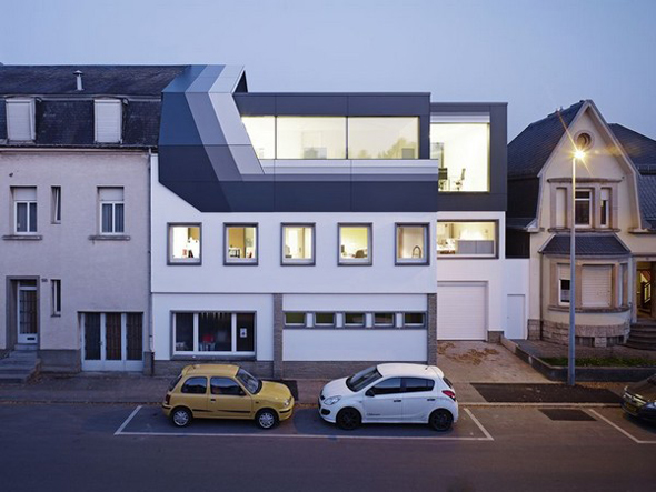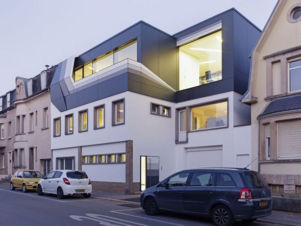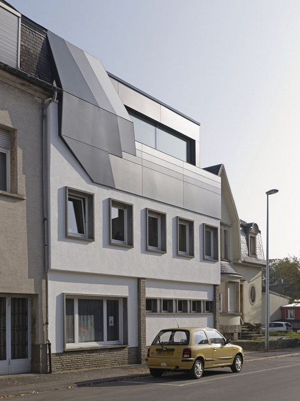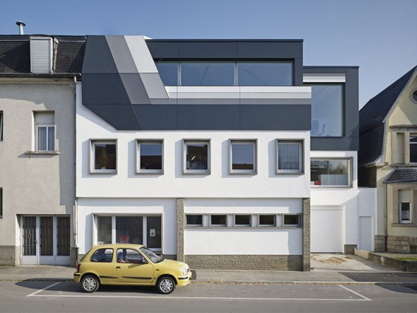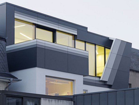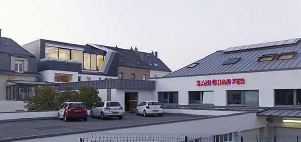 Roof top office à Dudelange, au Luxembourg est l’extension du siège de la société de Sanichaufer. Cette extension a été conçue par l’agence dagli + atelier d’architecture. Sanichaufer est l’une des plus grandes sociétés de construction des services d’ingénierie au Luxembourg, avec plus de 50 ans d’expérience. Les principaux domaines d’activité de Sanichaufer sont le chauffage, la climatisation et les systèmes de contrôle central. Pour cette raison, le Roof top office a été conçu comme une salle d’exposition permettant de présenter les technologies de construction les plus modernes.