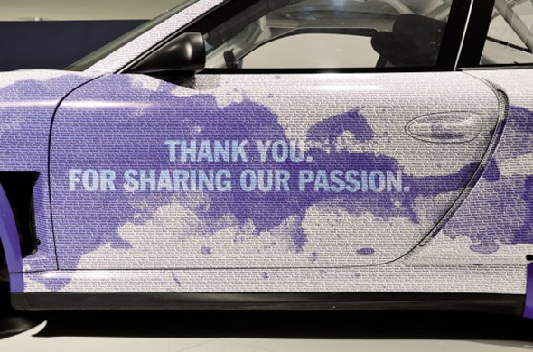 La marque Porsche a réalisé un modèle unique de la 911 GT3 R Hybrid à l’occasion du million de fan de la page Porsche sur Facebook. Le nom de tous les fans de la page ont été sérigraphiés sur le bolide. Alors pour ceux qui font parti de ce groupe Facebook, vous avez l’honneur d’avoir votre nom inscrit sur un modèle unique de Porsche !