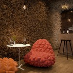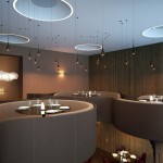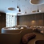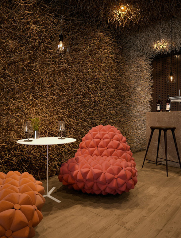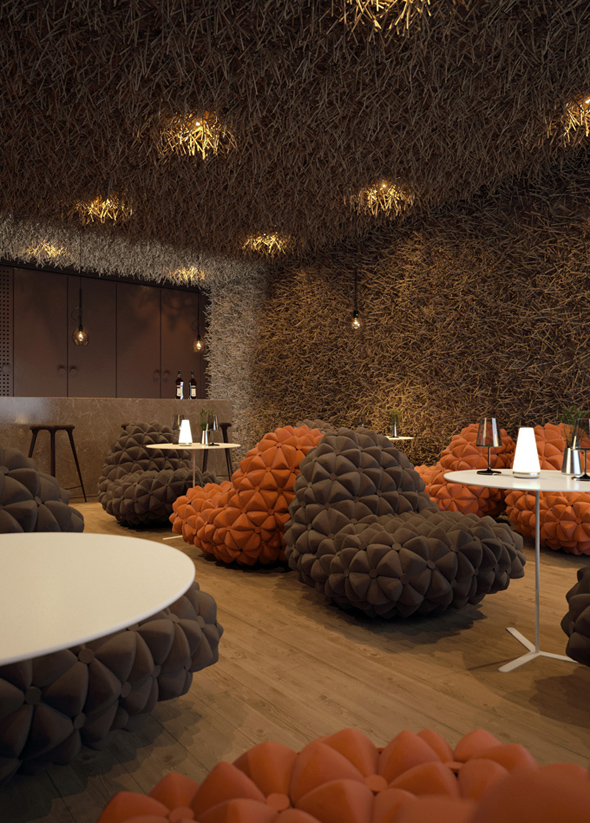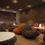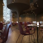 La décoration du restaurant est très sculpturale, la mezzanine ressemble à un nid d’oiseau et le mobilier semble des plus confortable. Le tout dans des tons chaud qui apporte calme et sérénité à l’espace.