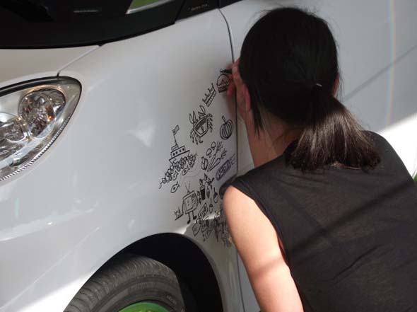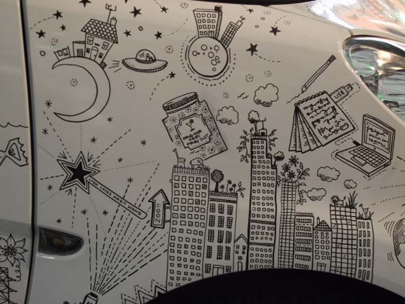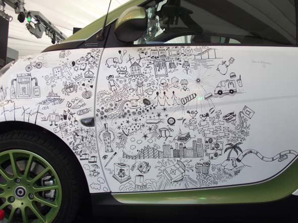 Pour le lancement de la Smart électrique, la marque a demandé aux utilisateurs de Twitter de donner leur vision du futur. L’artiste Johanna Basford a alors retranscrit ces visions par des dessins noirs sur une smart blanche. Découvrez son travail dans la vidéo dans la suite.