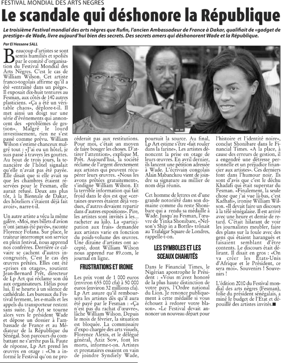 Nous vous parlions le 5 Septembre (ici) de la situation que vivent plus de 100 artistes dont les oeuvre ont été « prises en otage » à la suite du 3e Festival Mondial des Arts Nègres à Dakar. De plus en plus d’articles de presse sont publiés jour après jour en vue d’essayer de régler cette situation. Je vous laisse découvrir ces articles dans la suite. N’oubliez pas de signer la pétition!