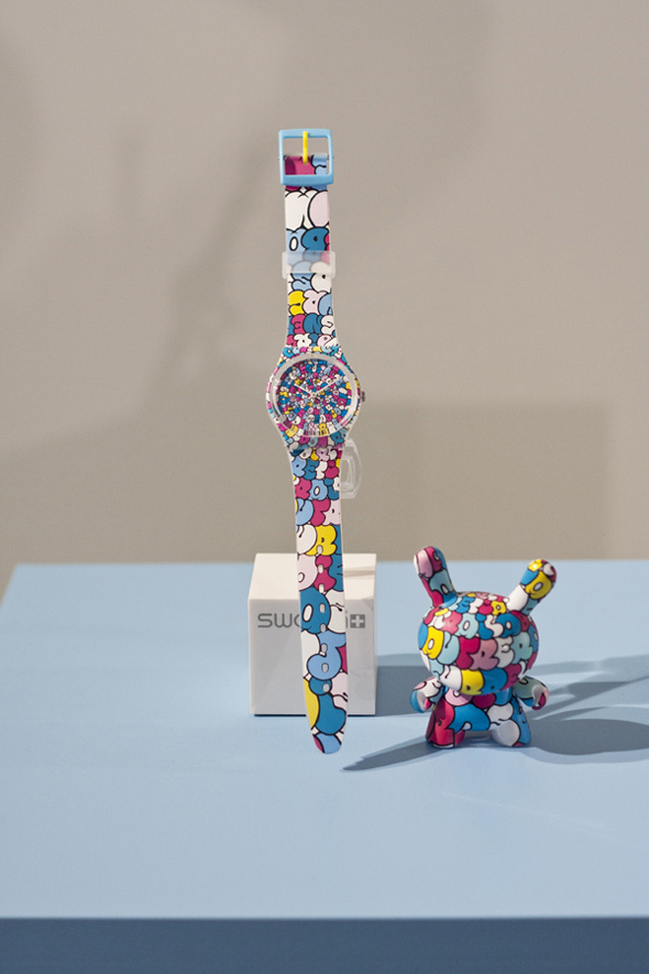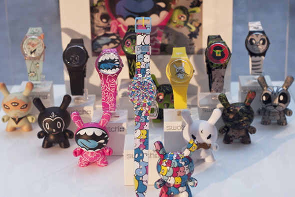 Le 13 septembre dernier avait lieu la soirée de lancement pour la dernière collection de Swatch. Une collection un peu particulière puisqu’elle s’est faîte en collaboration avec les artistes hauts en couleurs de Kidrobot qui ont chacun dessiné une montre. Les montres se vendent pour 50 euros et sont accompagnées de leur figurine assortie décorée par l’artiste.