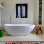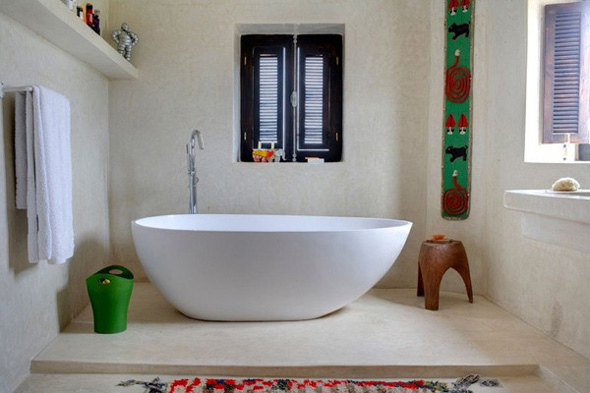 Inspirés par l’environnement calcaire de la région, les maîtres des lieux ont utilisé la chaux extraite des carrières voisines pour recouvrir du sol au plafond la pièce d’eau. Du fait de sa forte imperméabilité, le « tadelakt » en berbère, est donc originellement employé pour enduire les citernes d’eau. Ferré avec un galet de rivière puis traité au savon noir, son rendu procure un aspect doux au toucher avec un effet luisant. Au centre de la salle de bains, une large et haute baignoire légèrement surélevée nous invite à nous y prélasser.