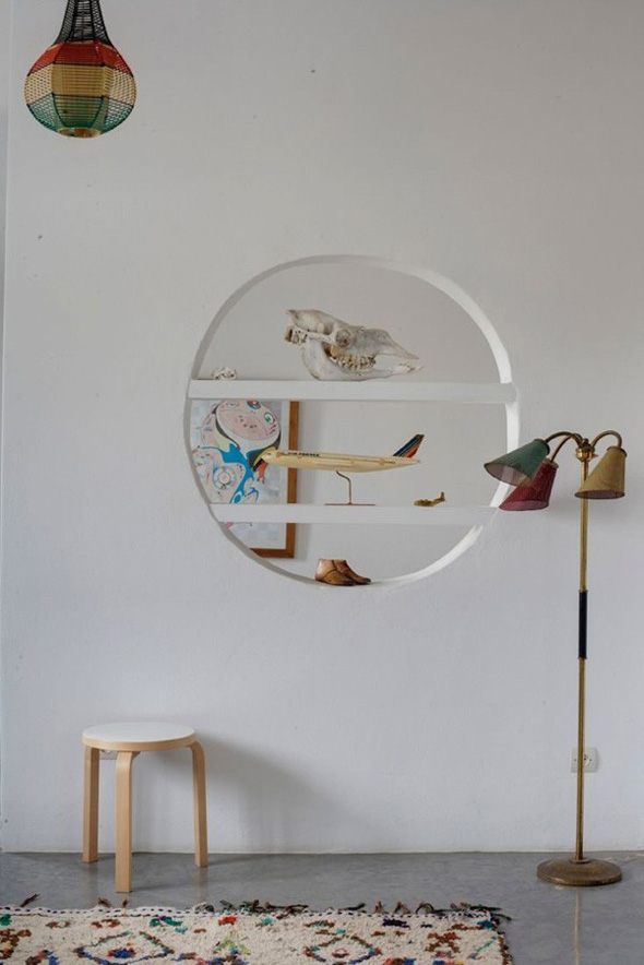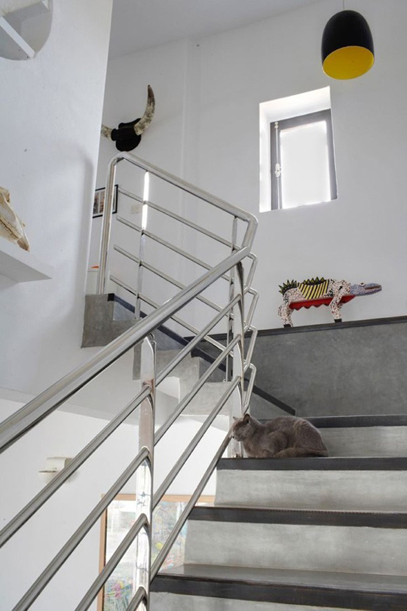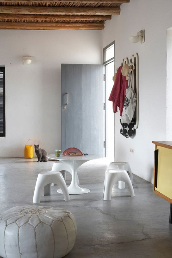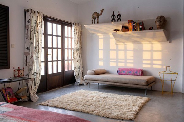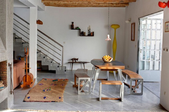 L’aspect intérieur de la maison est fluide et confortable. Le mélange optique de touches de couleurs chaudes et ocres procurées par les objets de décoration égayent l’ambiance du lieu. Aussi, cette maison humble et bien pensée se fond totalement dans son environnement extérieur.