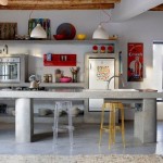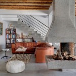 Pour accompagner harmonieusement ces matériaux bruts et traditionnels, les propriétaires ont eu l’idée séduisante d’opter pour un mobilier moderne et vintage aux couleurs terracota et aux lignes très épurées. Une cheminée suspendue en béton brut, une large bibliothèque promettent aussi des soirées cosys en famille.