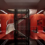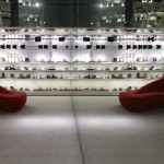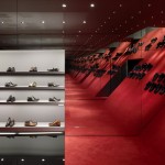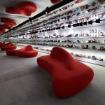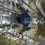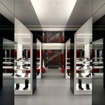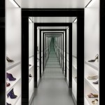 La boutique flagship de la marque de chaussure Kurt Geiger. Un peu dans l’idée d’un « palais des miroirs », l’espace se reflète avec une mise en abîme qui nous fait perdre nos repères.
