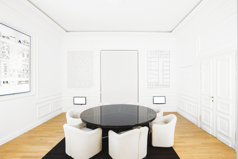 Un monolithe était planté au milieu du salon, aussi intrigant qu’attrayant, montrant quatre portraits vidéo – la styliste Agnès B, le photographe Elliot Erwitt, l’artiste Michelangelo Pistoletto et l’écrivain et réalisateur Alain Fleischer – chacun exprimant ses préoccupations et donnant son avis sur l’espace bureau.