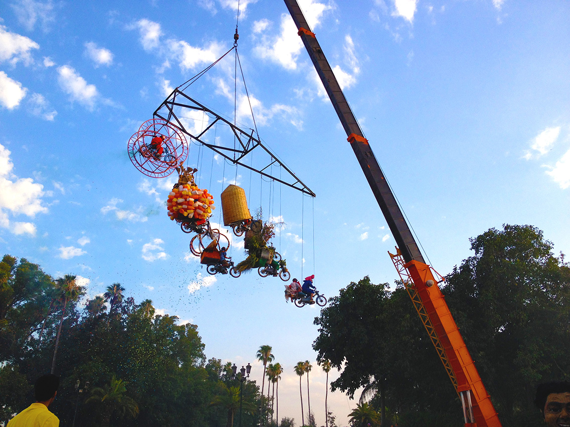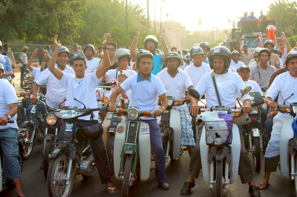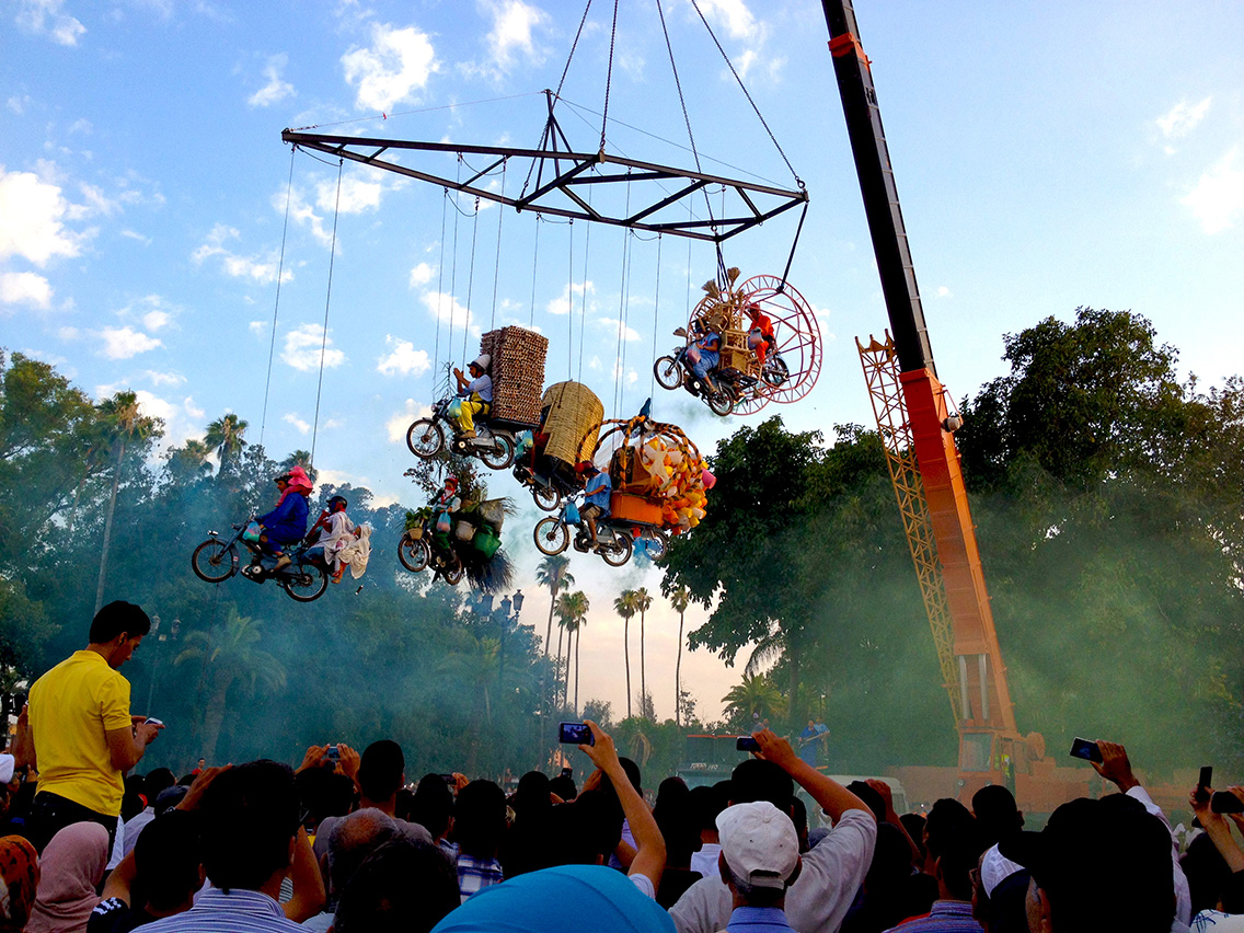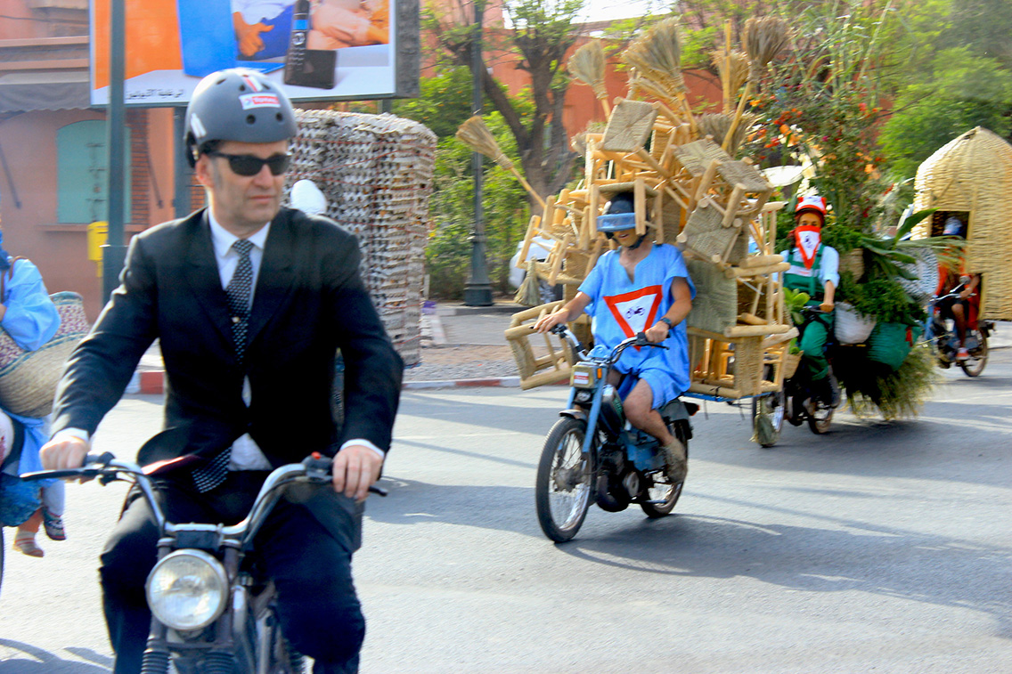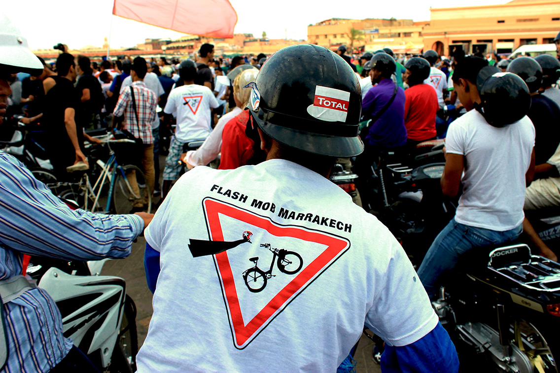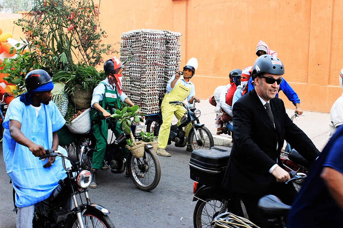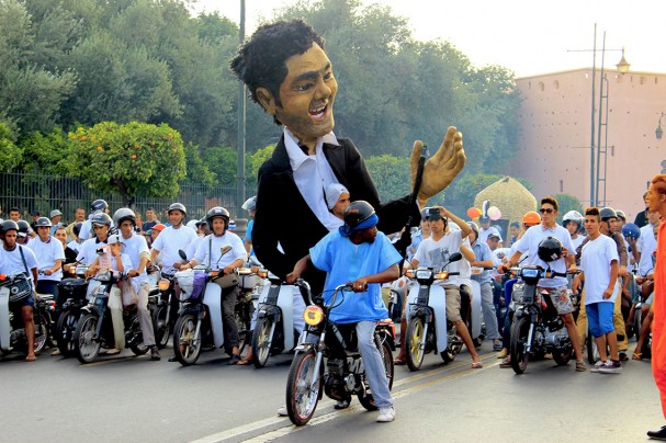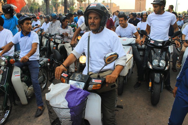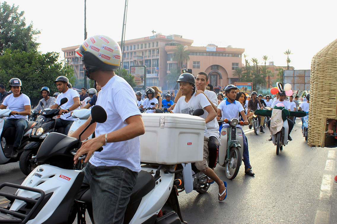Ce dimanche, près de 700 mobylettes se sont emparées les rues de Marrakech suivies d’un convoi de plusieurs milliers de personnes haut en couleur et en pétarades. Cette FlashMob de Mob a été initiée par la compagnie spécialisée dans le trafic d’acteurs et d’engins (Sic.) Générik Vapeur.