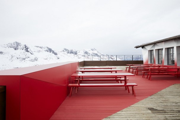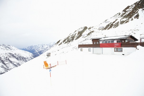 « Audi quattro Festkogl Alm », Obergurgl, Autriche, 2650 mètres d’altitude. Niché au creux de la montagne, ce refuge étonne tant par sa couleur que par son architecture.