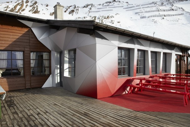 Réalisé par le studio Designliga, le bâtiment brise les codes. Son design novateur attire l’oeil et ne laisse pas indifférent. Le rouge écarlate se détache du blanc immaculé des montagnes, tandis qu’une structure géométrique grignote peu à peu la façade. Imaginé pour promouvoir aux pieds des pistes la dernière voiture d’Audi, ce refuge illustre bien l’alliance de rupestre et du moderne.