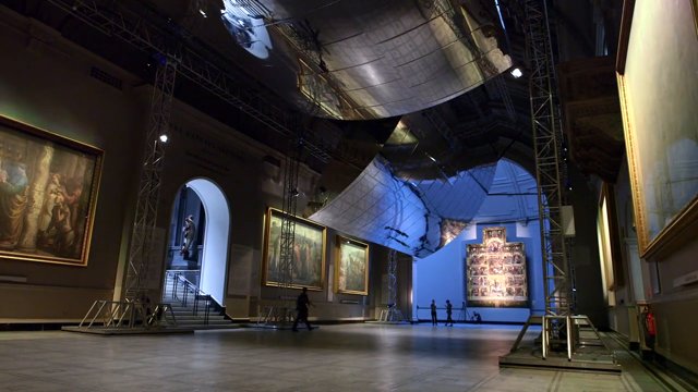 Transposant leur sensibilité et leur précision, ils ont imaginé et créé ensemble une imposante structure qui vienne épouser les courbes de la galerie Raphael pour offrir aux visiteurs une expérience esthétique nouvelle. Liés à cette immense structure métallique, deux panneaux concaves monumentaux pivotent avec élégance et légèreté, si bien que l’on en vient à oublier la structure même de la création. Chacun des panneaux est entièrement recouvert d’un métal poli et brillant dans lequel viennent se refléter les peintures des maîtres, offrant ainsi au regard une perception nouvelle des œuvres. Quand la mécanique rencontre la sensibilité… la poésie nous ouvre alors grand les yeux.