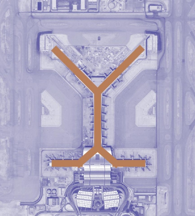 D’un point de vue formel, dans les airs, l’aéroport montre à voir des lignes pures, qui s’écartent et se rejoignent pour offrir depuis le ciel une parenthèse élégante.