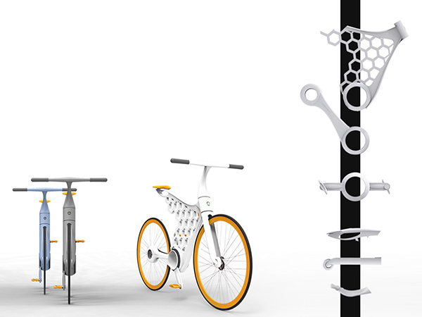 Le cadre de nylon, la fourchette et le guidon sont les seules pièces (avec les roues) qui ne sont pas fabriquées grâce à l’impression en 3D. Leur fabrication reste cependant facile et abordable en cas de remplacement. Le reste de la bicyclette est quant à elle pensé en tant que résistance et légèreté. La forme hexagonale du cadre lui donne une force incroyable. Le plus, non négligeable de cette création, réside dans la possibilité de personnaliser les pièces à son gout pour une apparence entièrement unique !