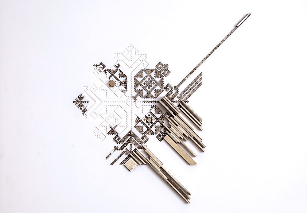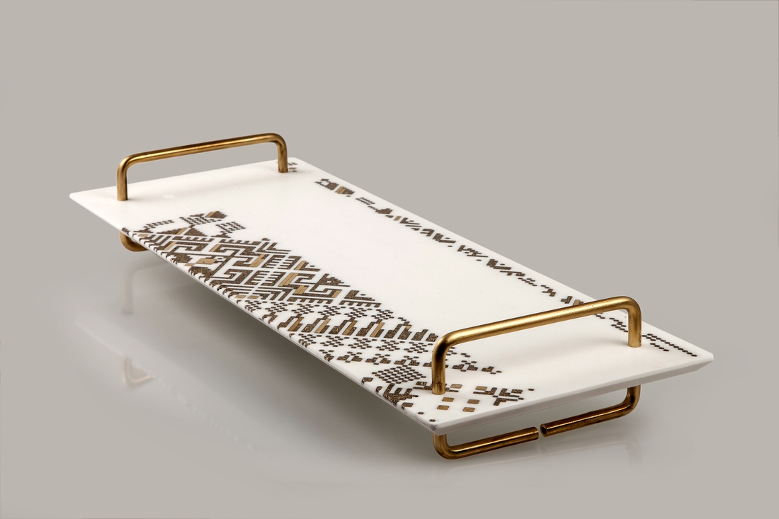 Superbe travail de Nisreen & Nermeen ABU-DAIL qui ont parfaitement réussi à combiner les motifs traditionnels Jordaniens utilisés dans la broderie artisanale avec des matériaux tels que le Corian, le cuivre et le fil de cuire. Le résultat est un motif surprenant où se superpose matières, couleurs, textures dans une joyeuse déconstruction graphique.