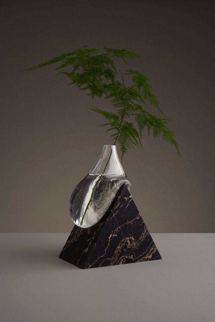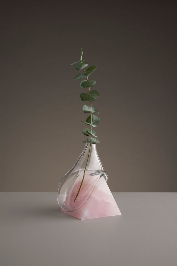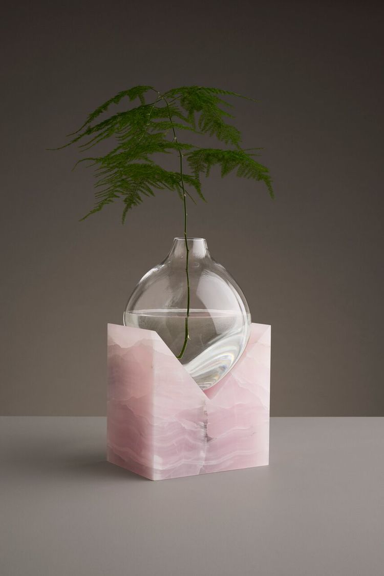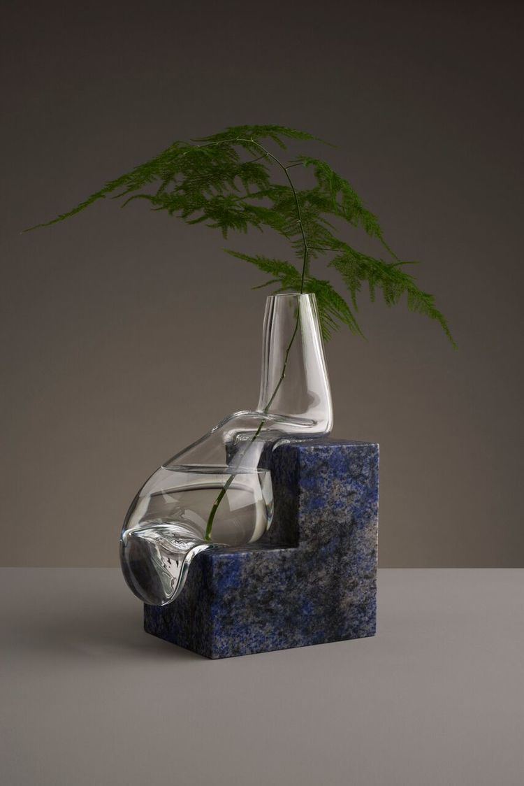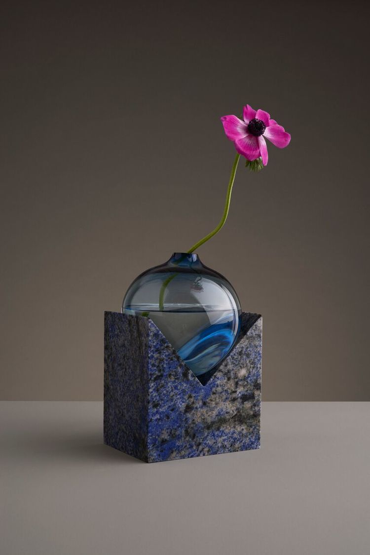 Les vases sont soit fonctionnels soit décoratifs. Le contraste entre les formes en verre, qui ont l’air de fondre, et la roche coupée de façon angulaire est très intéressant. Celui-ci met en évidence une interaction entre l’aspect fragile du verre et l’aspect robuste de la roche.