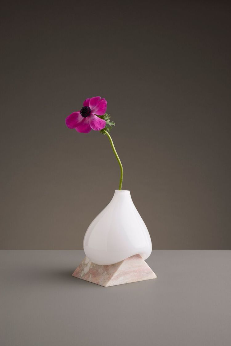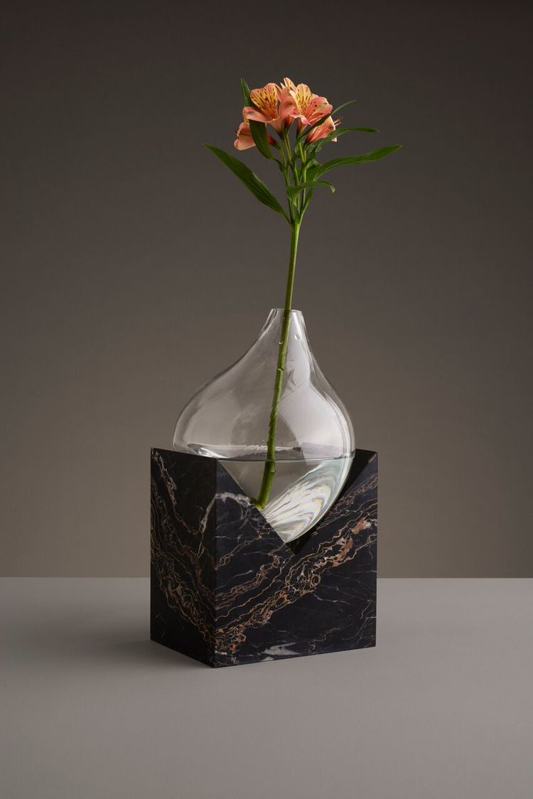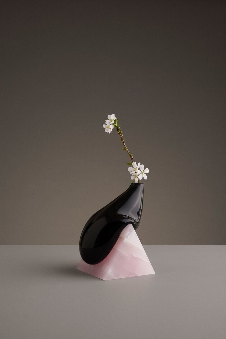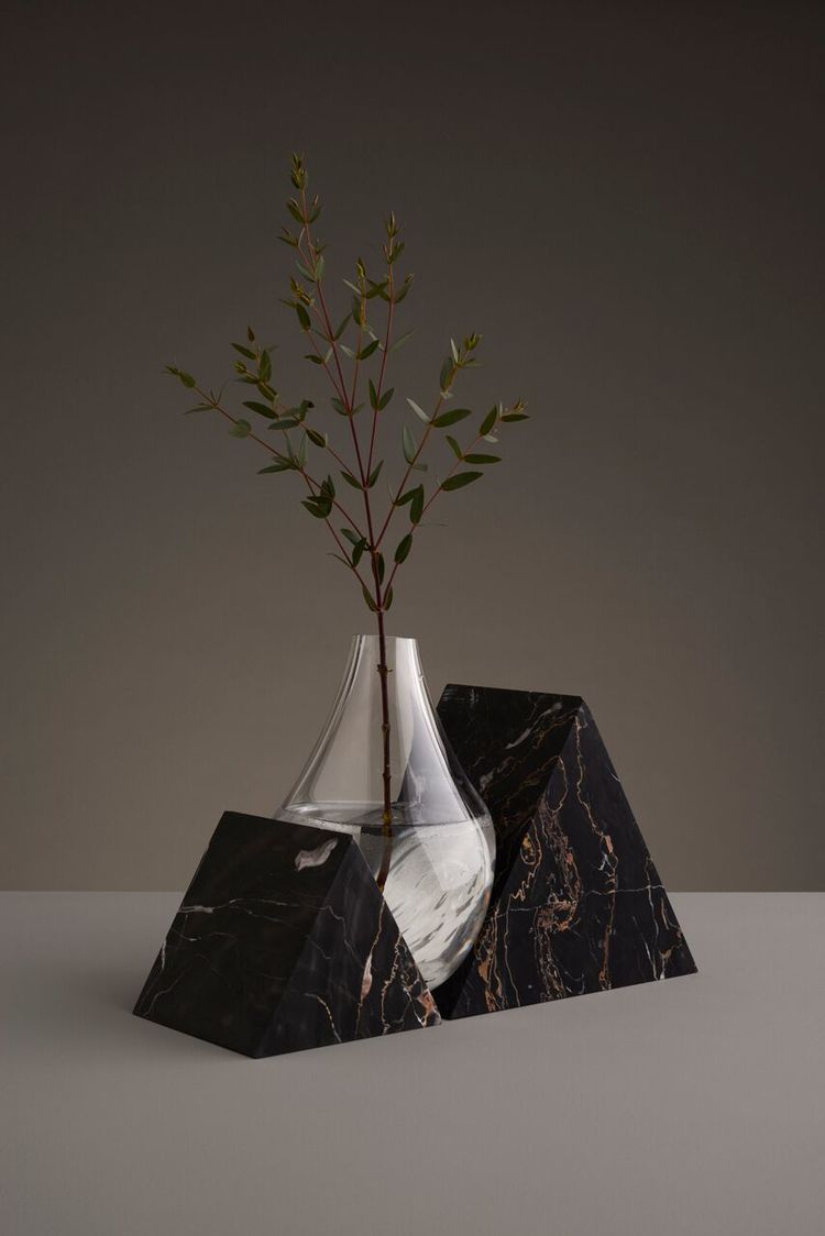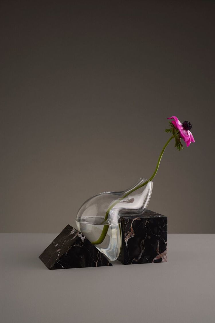 Les vases sont soit fonctionnels soit décoratifs. Le contraste entre les formes en verre, qui ont l’air de fondre, et la roche coupée de façon angulaire est très intéressant. Celui-ci met en évidence une interaction entre l’aspect fragile du verre et l’aspect robuste de la roche.