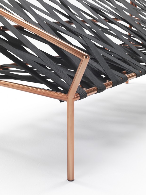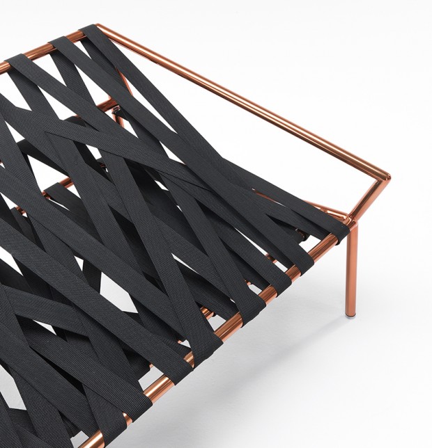 Ce canapé est l’oeuvre inventive d’un duo de designer italo-grec composé de Katia Meneghini et Thanos Zakopoulos. L’ossature du meuble consiste en une structure en cuivre lui donnant une touche élégante au produit. De plus, l’assise est couverte de 100 mètres de ruban élastique. L’aspect brute et minimaliste n’enlève en rien l’aspect décoratif du mobilier ainsi que le confort qu’il apporte.