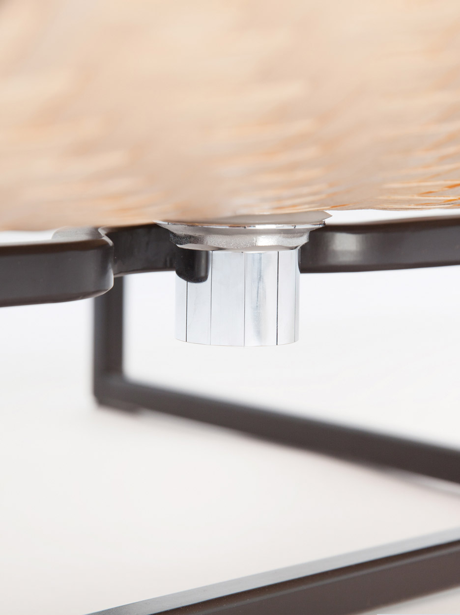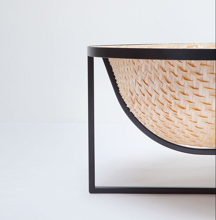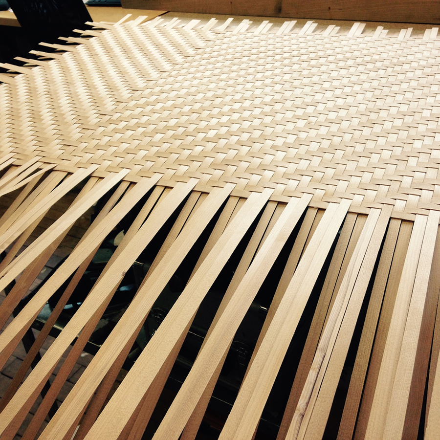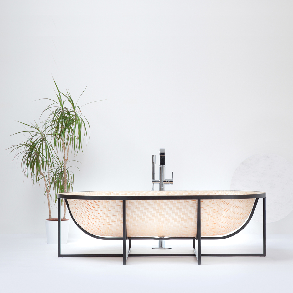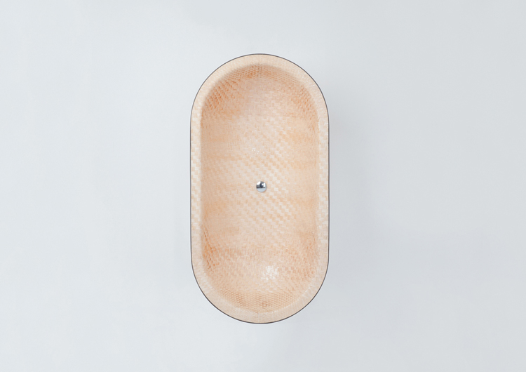 Les bandes de bois ont d’abord été tissées ensemble afin de créer une feuillée tressée. Cette dernière fût ensuite pressée dans un moule pour réaliser la forme. Pour ce faire, le designer a utilisé de la vapeur afin de rendre le bois assez souple pour être plié. Une fois la forme sèche, on applique une résine afin d’ajouter de la résistance et de la durabilité et plus important encore, rendre le bain étanche.