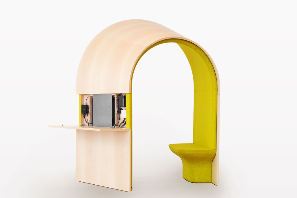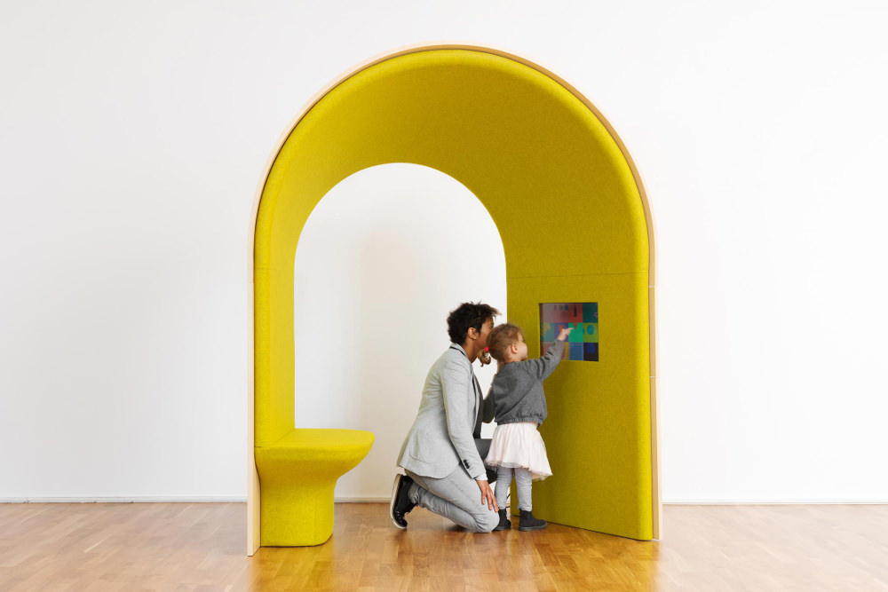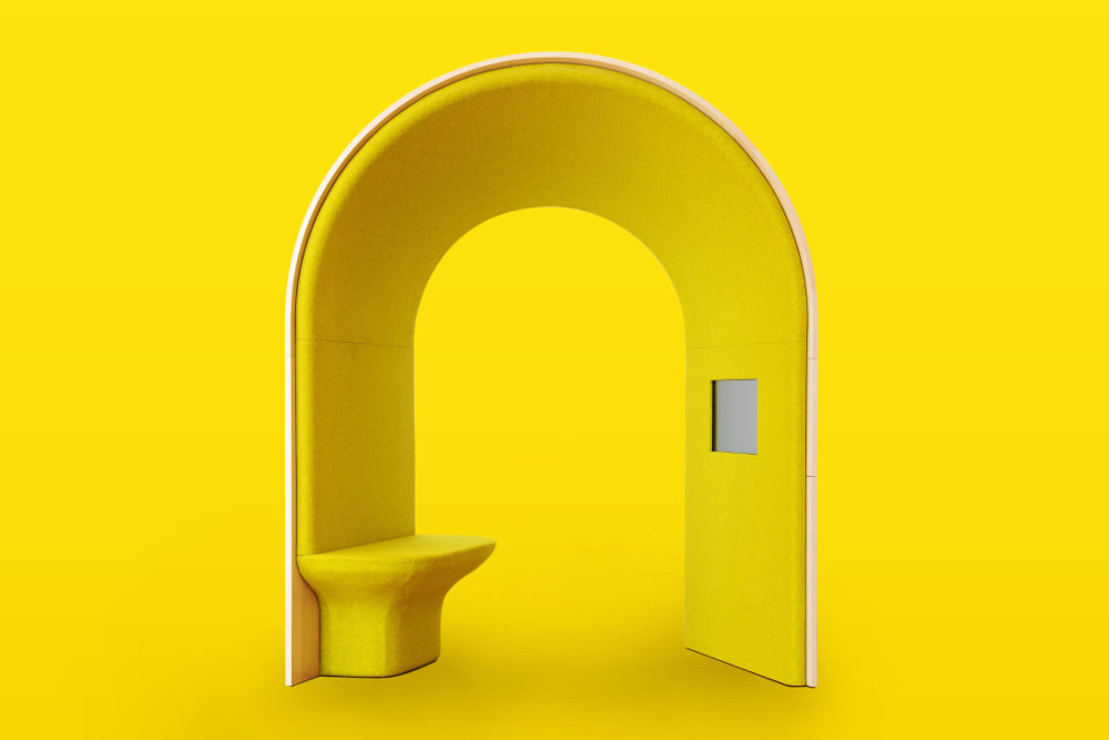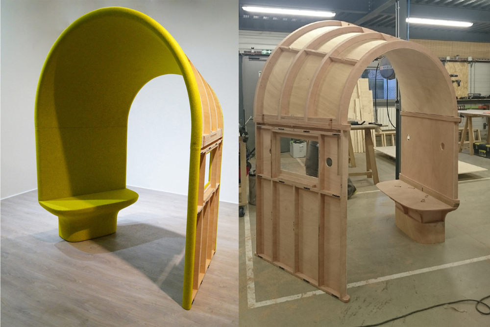 Sous sa forme voûtée, à l’image d’un abri, sa double peau apporte un confort et une intimité à l’usager lors de son passage intérieur et s’intègre parfaitement dans le lieu. La couleur jaune de la mousse égaye l’espace et attire le visiteur pour lui offrir un moment de repos agréable. Sa forme original ravira petits et grands, un micro-espace à la fois ludique et reposant.